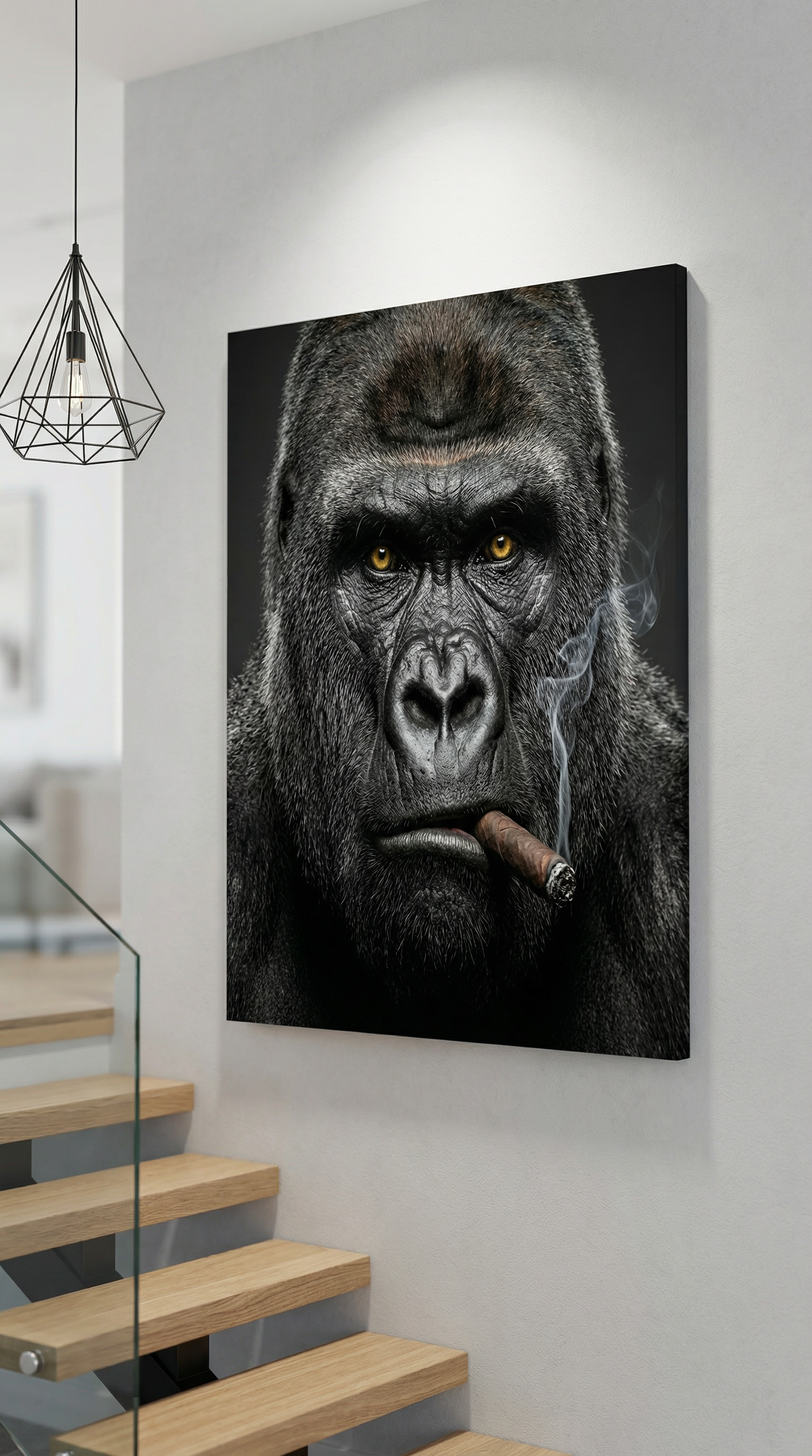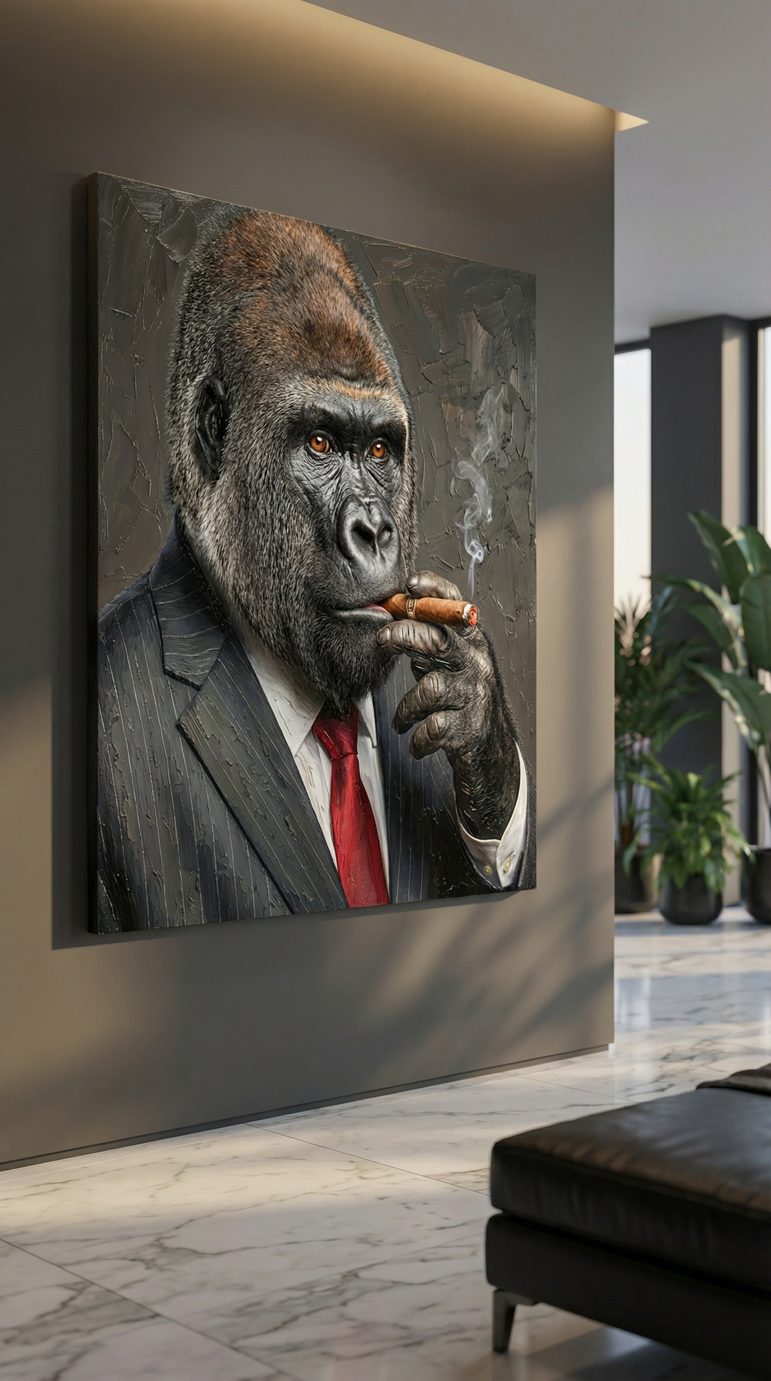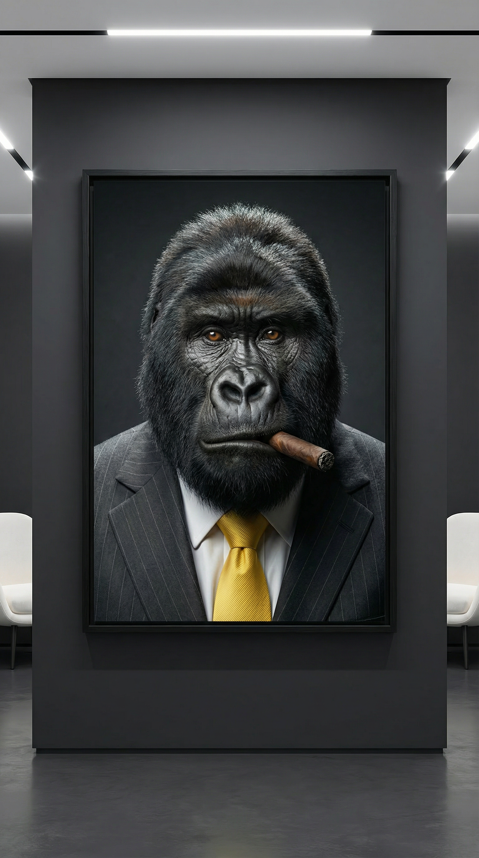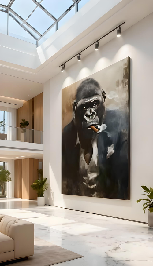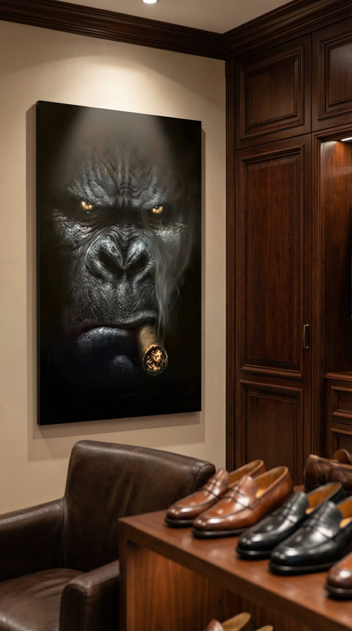 décoration murale luxe, tableau gorille costume cigare, art moderne premium, décoration intérieure haut de gamme.